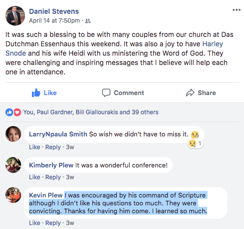 Questions can actually bypass the will to allow the Holy Spirit to work in a heart that would otherwise be resistant to God’s truth. The place to start with the most confused heathen is not with a litany of rebukes but questions. Proverbs 18:13 reminds us, “He that answereth a matter before he heareth it, it is folly and shame unto him.” Leadership without asking questions will always lead to folly, shame, and diminished influence. Notice the following response on Facebook from Kevin to a recent couples conference that Heidi and I had the privilege of teaching: