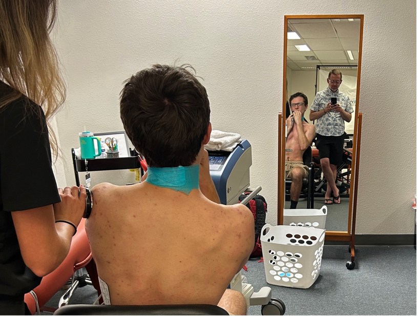 Even as we continue to navigate long-Covid issues with some success through insightful nutrition and therapy at Spero Clinic, the oral-facial pain and neurological struggles have not reduced much…leading, through a series of God-moments disguised as complications, us to do extensive testing on Landon’s spine. These MRI, Xray, CT, and other scans consistently indicate upper cervical issues including significant stenosis along with fusion of his top disc (C1) to the lower skull…right where the bright blue wrap is at in above picture. The doctors that we have consulted so far project that these structural issues have likely been present since birth and are, with the physical development alongside the introduction of Covid-related inflammation, seriously constricting blood flow and nerve pathways to the face. (Substantive anomalies, by the way, that no neurological treatment or diet/supplement intervention alone can resolve.)